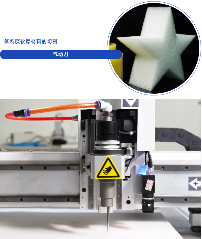 对于海绵、泡沫板等软厚且弹性较高的材料,气动刀是理想的裁床刀头选择。蔡伦科技CLT气动刀通过压缩空气驱动刀片上下振动切割材料,振幅最高可达到10mm,配合刀片切割厚度高达120mm,特别适合切割厚度大、柔韧度高、弹性强的材料。
